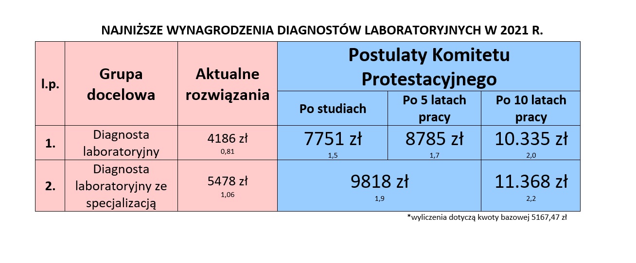 Poniżej prezentujemy tabelę z propozycjami najniższych wynagrodzeń diagnostów laboratoryjnych (kwotowo), które proponuje Komitet