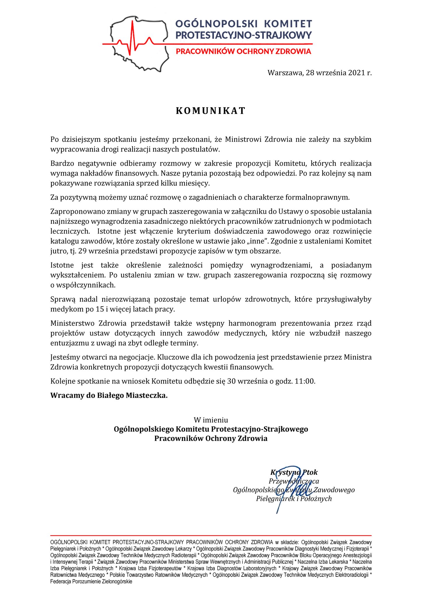 Komitet Protestacyjno-Strajkowy Ochrony Zdrowia spotkał się w Centrum Partnerstwa Społecznego "Dialog" w Warszawie z wiceministrem zdrowia ds. dialogu Piotrem Bromberem.