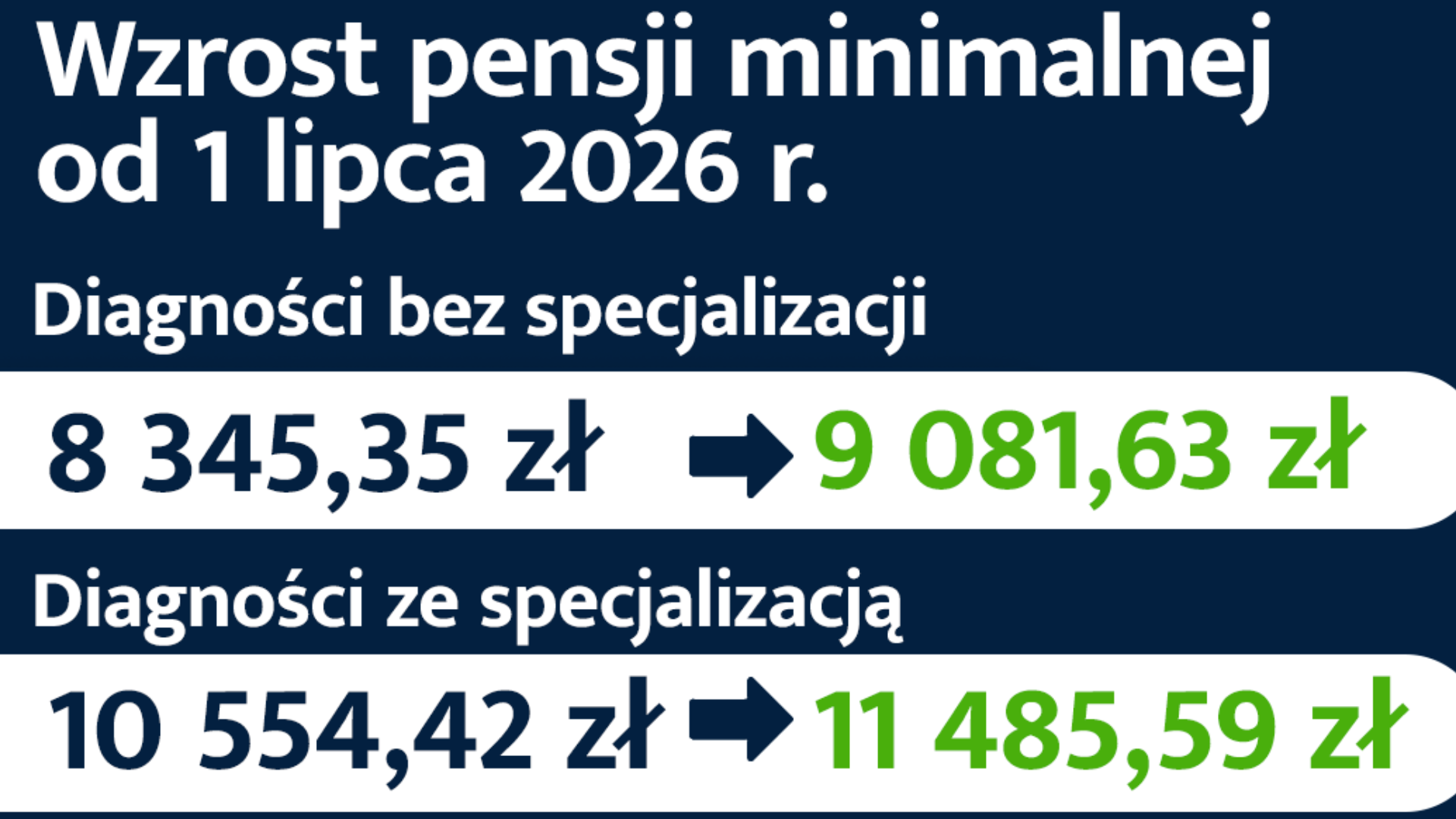 W przypadku diagnostów laboratoryjnych ze specjalizacją wynagrodzenie do lipca 2026 wynosi 10 554,42 zł, natomiast od lipca wzrośnie do 11 485,59 zł brutto. Oznacza to podwyżkę na poziomie 931,17 zł brutto.